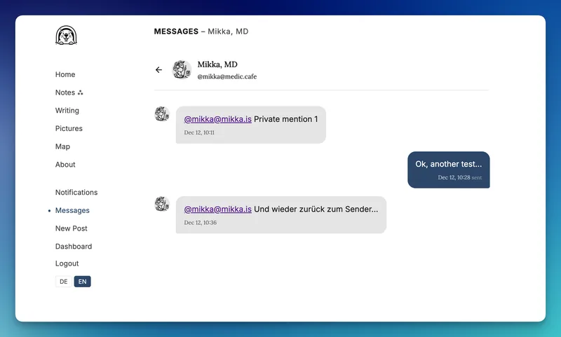 So, nach einer langen, schlaflosen, Nacht, in der ich mich mit Mastodon’s totaler “zero fucks given” Implementation von DM rumschlagen musste (funktionierte perfekt für alle Systeme, die sich an den Standard halten), gehen jetzt auch DM in Hule.